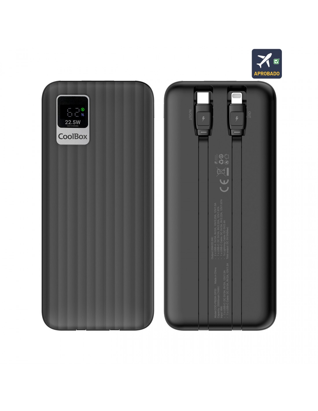 COOLBOX POWERBANK DP20 20000MAH LCD+CABLES INTEGRADOS USB-C+LIGHTING NEGRO CARGA RAPIDA